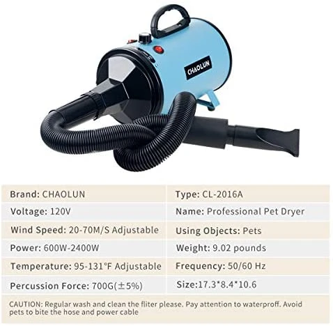 - The CHAOLUN High Velocity Pet Hair Dryer is designed for quick and efficient drying of your dog or cat after baths. Its powerful motor ensures fast drying while being gentle on your pet’s skin.