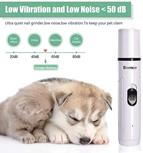 - Boence Dog Nail Grinder, Pet Nail Grinder Super Low Noise & Vibration: Many pets get stressed by the sound and vibration of pet nail grinder. However,Our Pet Nail Grinder is equipped with super mute motor, It gently trim your pets nail with low noise <50db and low vibration,which helps with the pets anxiety.