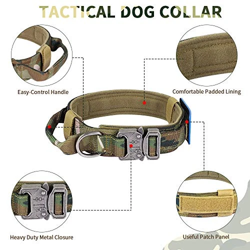 - ???? DOG COLLAR FOR LARGE DOGS – The neck girth of the tactical dog collar is 17-21in, width 1.5in. Thoughtful double closure (velcro metal buckle) is easy to put on/off and prevent your dog from tearing it up. A control handle is easy for you to control your dog at close range