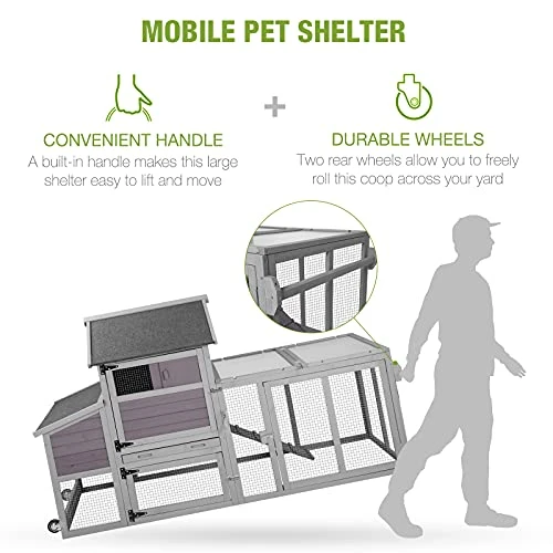 - ???? 81in Mobile Chicken Coop Multi-Level Hen House, Wooden Poultry Cage: Easily move your coop from place to place thanks to durable, built-in wheels with a convenient handle on the front.