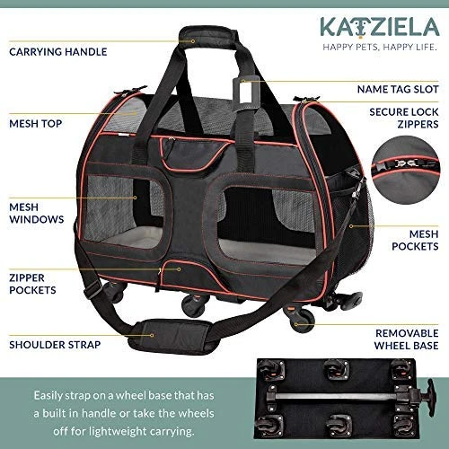 - OUTSTANDING STRUCTURAL DESIGN: WPS compact pet travel carrier is composed of an upgraded super-strong metal and durable materials which offer maximum strength and durability. The wheels makes it convenient for travelers to walk through airports with long walks. It also features hand-carry straps and a no-slip, adjustable shoulder strap for easy pulling and pushing. It arrives neatly packed in a bonus carrying bag, and is easy-to-assemble.