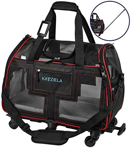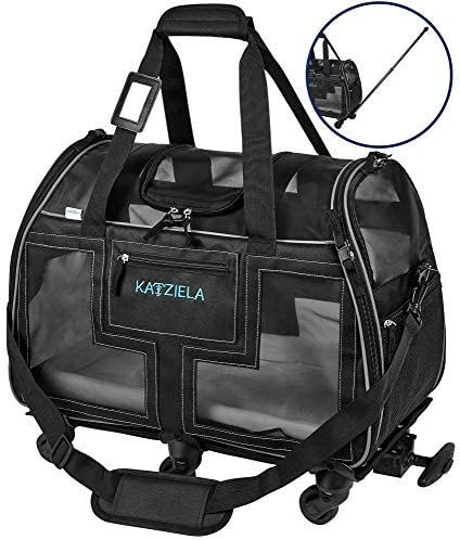 - Katziela Airline Approved Pet Carrier REMOVABLE ROLLING WHEELBASE – A six-wheel base extends beyond the carrier’s edge to ensure it won’t tip over as you and your pet roll along at a brisk airport pace.Â
