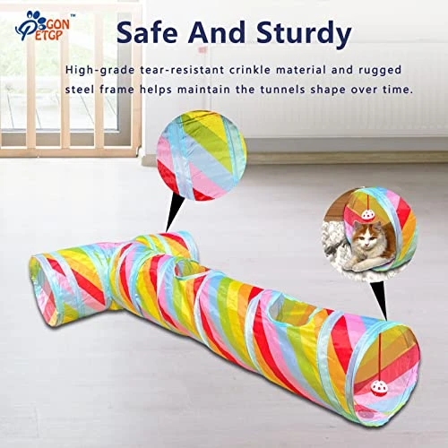 - ????Attractive and Funny: Our Tunnel play house made of bright rainbow color crinkle crackle paper. Small ball and bell for cats to play are hung at the exit, truly a great way to encourage daily exercise and keep your pet active.