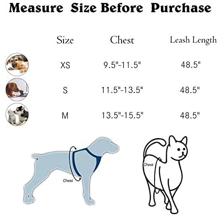 - Size XS: Chest girth: 9.5″-11.5″, Leash size: 48.5″.TIPS: Save you time and money, Please accurately measure your pet’s chest size before selecting the size. (measured by the human waist circumference measurement method, And accurately select the size range of the size chart)
