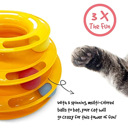 - THREE LEVELS: Three brightly colored balls swirl around the multi-level tracks, encouraging batting and a cat’s natural hunting instincts. Cutouts above each level are perfect for attacking balls from above.