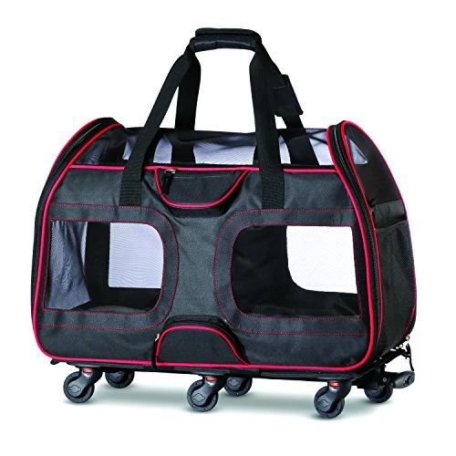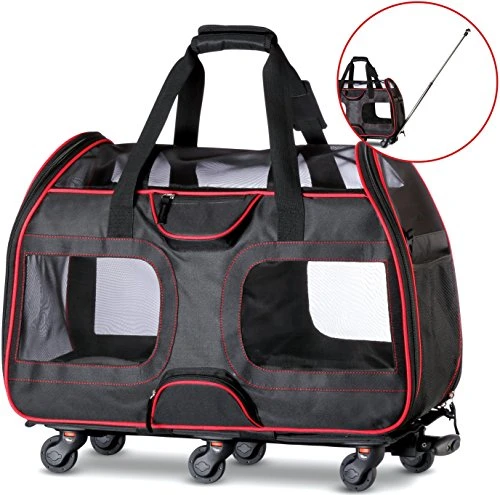 - VERSATILE & EFFICIENT: Pull this carrier on its wheels with a handle strap or metal rod, or carry it with the handle or shoulder strap. It includes a leash to clip on your pet’s collar for security.