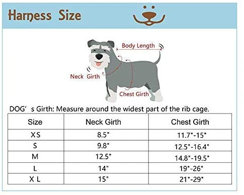 - Size S – Neck girth 9.8″,chest girth adjustable from 12.5″ to 16.4″.It’s important to make sure that your dog’s head fits it and that the chest position is adjustable.