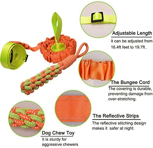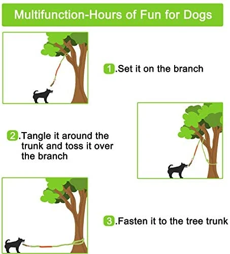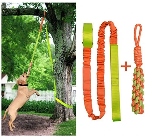 - Easy to Install & adjustable height -You simply toss the strong bungee cord over the strong branch or other suitable mount in minutes, loop it and pull it snug. Also, the length can be adjusted to 17 feet.So you can hang at the desired height for your canine friend.The outer covering is tough and retractable,protecting elastic webbing from over-stretching.
