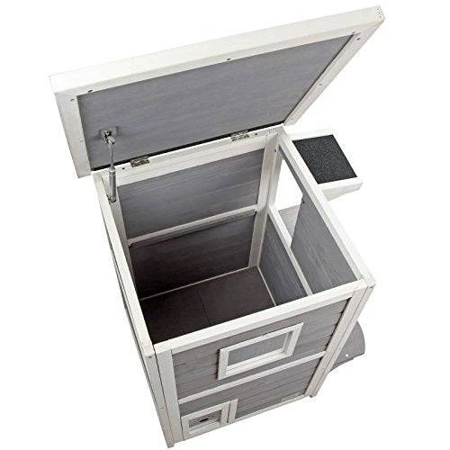 - Petsfit 2-Story Kitty Cat House Two story cat condo for outdoor use. TOP CAN BE OPENED FOR EASIER CLEANING