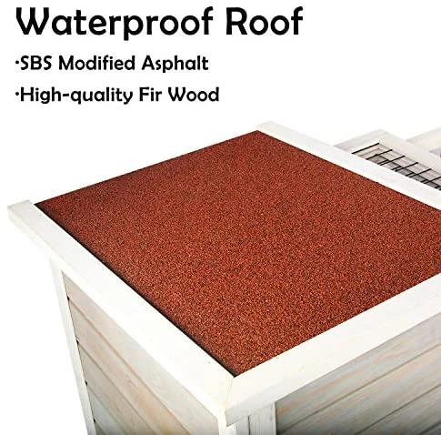 - Material: Wooden Rabbit Hutch Made by Fir with environment-friendly water-based paint. Including a main house and a Yard. SBS modified asphalt waterproof material on top.