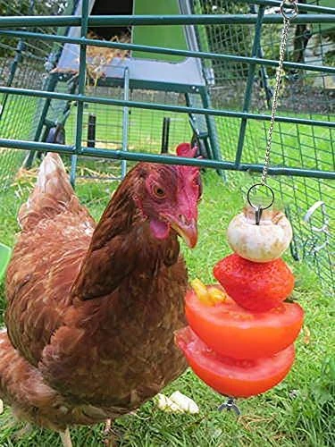 - Easy to install and use, simply skewer your chicken’s favorite fruits and veggies and hang it in the coop. Watch as your hens enjoy a fun and nutritious treat!