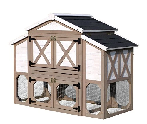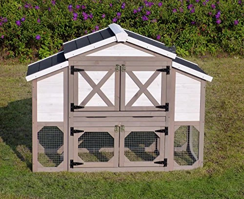 - The house chicken coop is made of Canadian Hemlock with an Oil-Based Stain in White &Grey. Black asphalt Roof panels