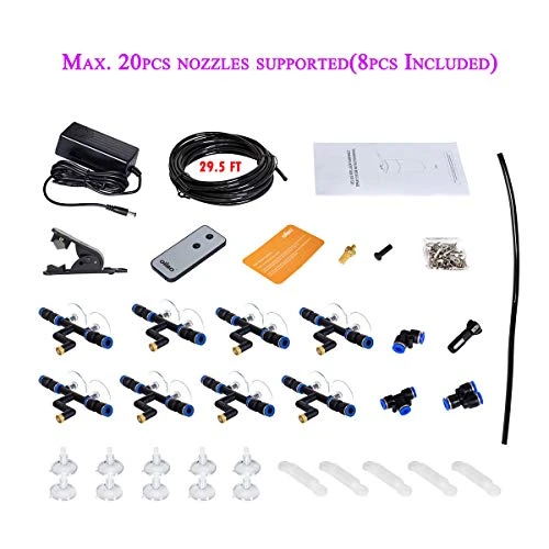 - 【SUPER SILENT PUMP & 360°ROTATION SPRAY NOZZLES】The diaphragm silent pump works very stable and soundless, provides your pet a comfortable and quiet environment. It can connect 20pcs spray nozzles and work at the same time through a long 29.5ft(9m) black pipe. (8pcs spray nozzles included)