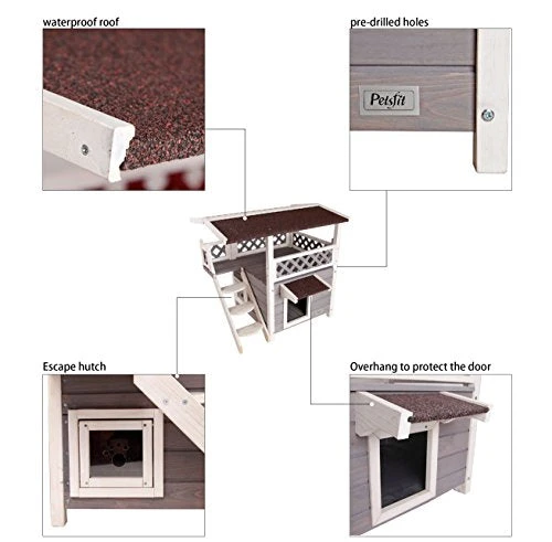 - Petsfit 2-Story Outdoor Cat House Easy to assemble with pre-drilled hole and stair design created more fun for pets